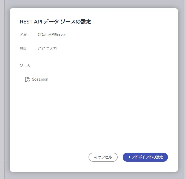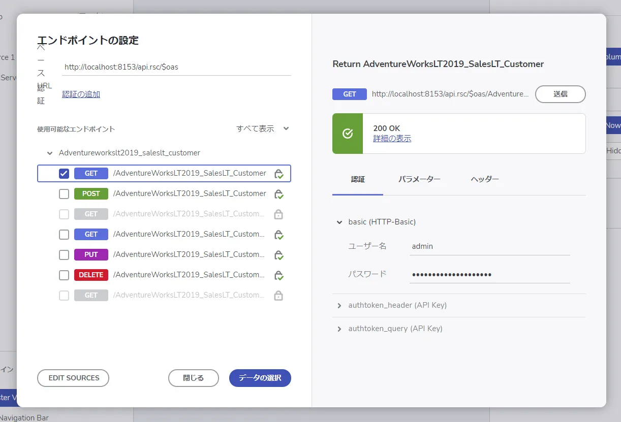 - 「エンドポイントの設定」ではOpenAPI で定義されているエンドポイントの一覧の中から利用するものを選択し、App Builder で利用するデータソースとして定義します。今回はデータの一覧が取得できるGET エンドポイントを指定し、事前に作成したユーザーID・トークンを使って必要な認証情報を入力します。