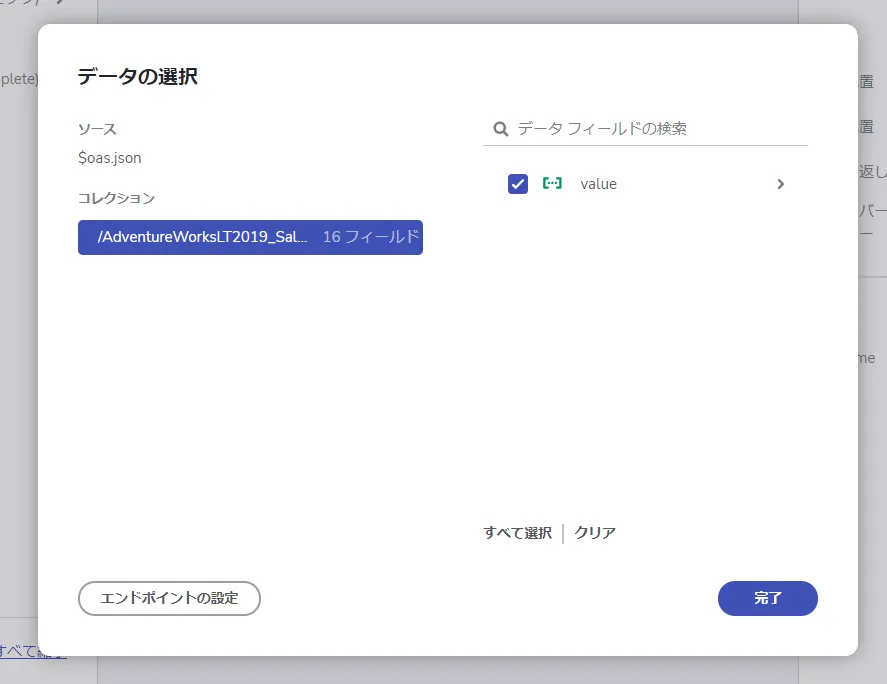 - 最後にデータの選択です。ここではUI 上にマッピングするためのデータフィールドを持つ配列要素を指定します。CData API Server はすべて「value」配下で要素を提供するための以下のように「value」のところにチェックを入れておくだけでOKです。
