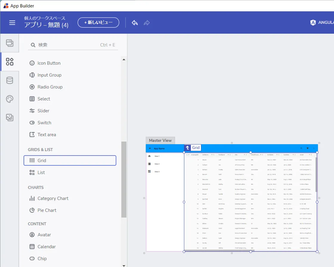 データソースの設定が完了したら、一覧画面を作成していきましょう。今回はGrid のコンポーネントを利用して、一覧画面を作成します。