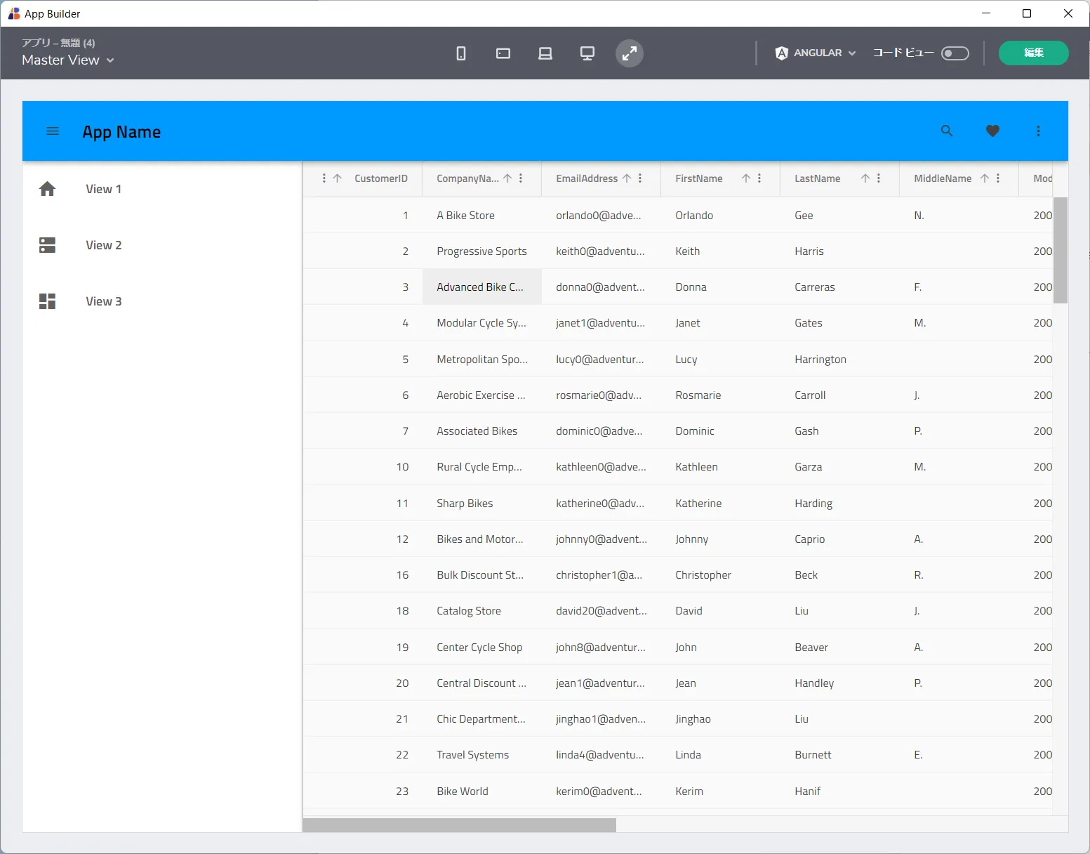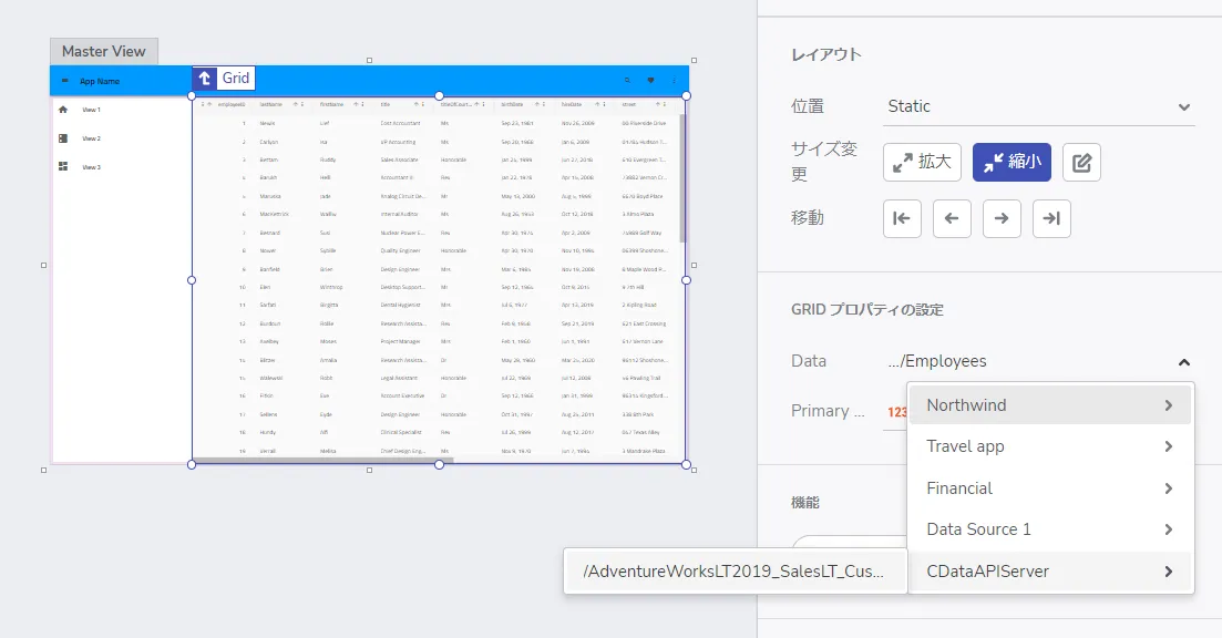 - これを行うだけで、そのまま画面上にCData API Server 経由で取得した結果が一覧画面として構成されます。