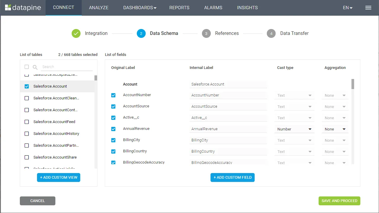 - Data Schema ステップで、ビジュアライズするテーブルとフィールドを選択し、「Save and Proceed」をクリック