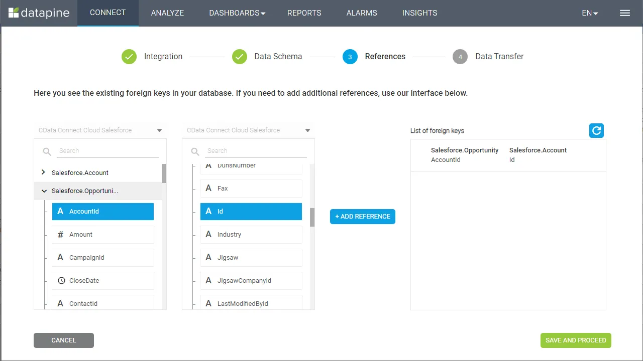 - References ステップで、選択したテーブル間のリレーションシップを定義し、「Save and Proceed」をクリック