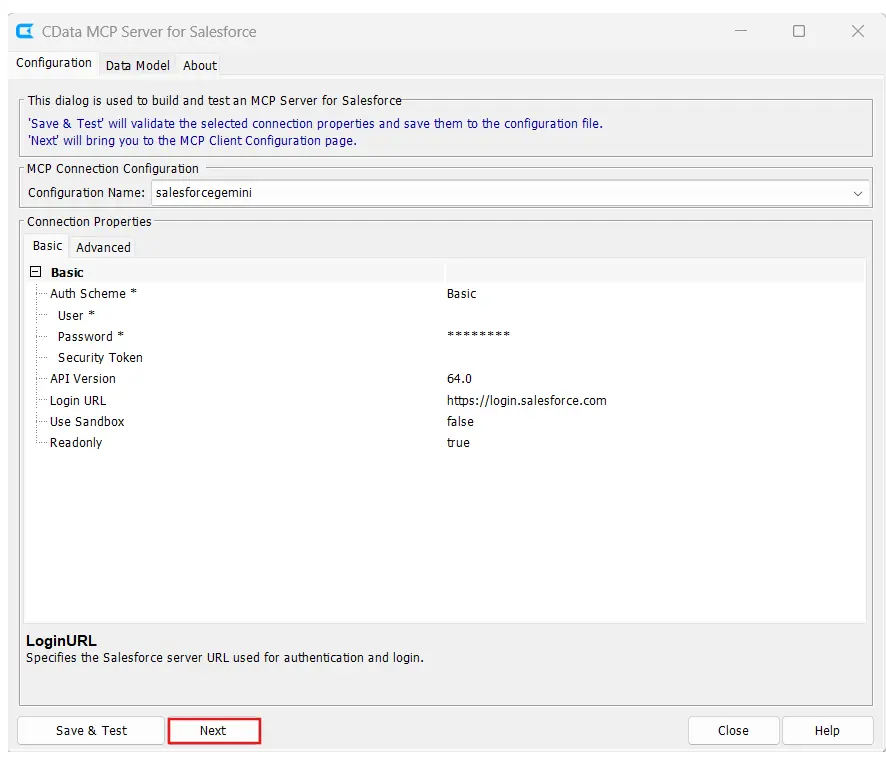 設定ウィザードで、適切な接続プロパティを入力します。