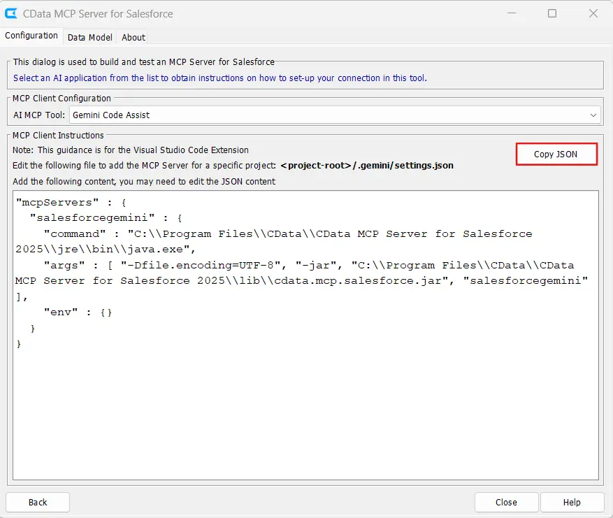 Copy JSON をクリックして、生成された MCP 構成をクリップボードにコピーします。