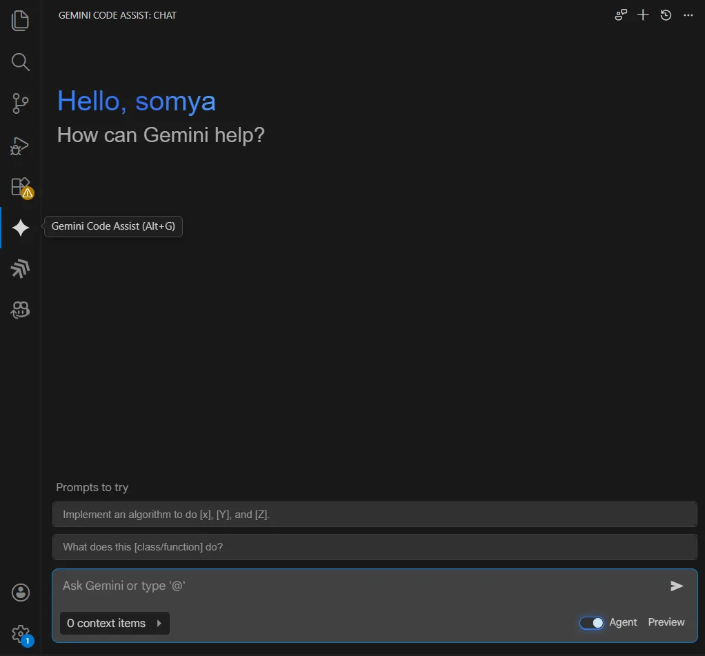 Visual Studio Code を開き、アクティビティバーの Gemini Code Assist を選択します。