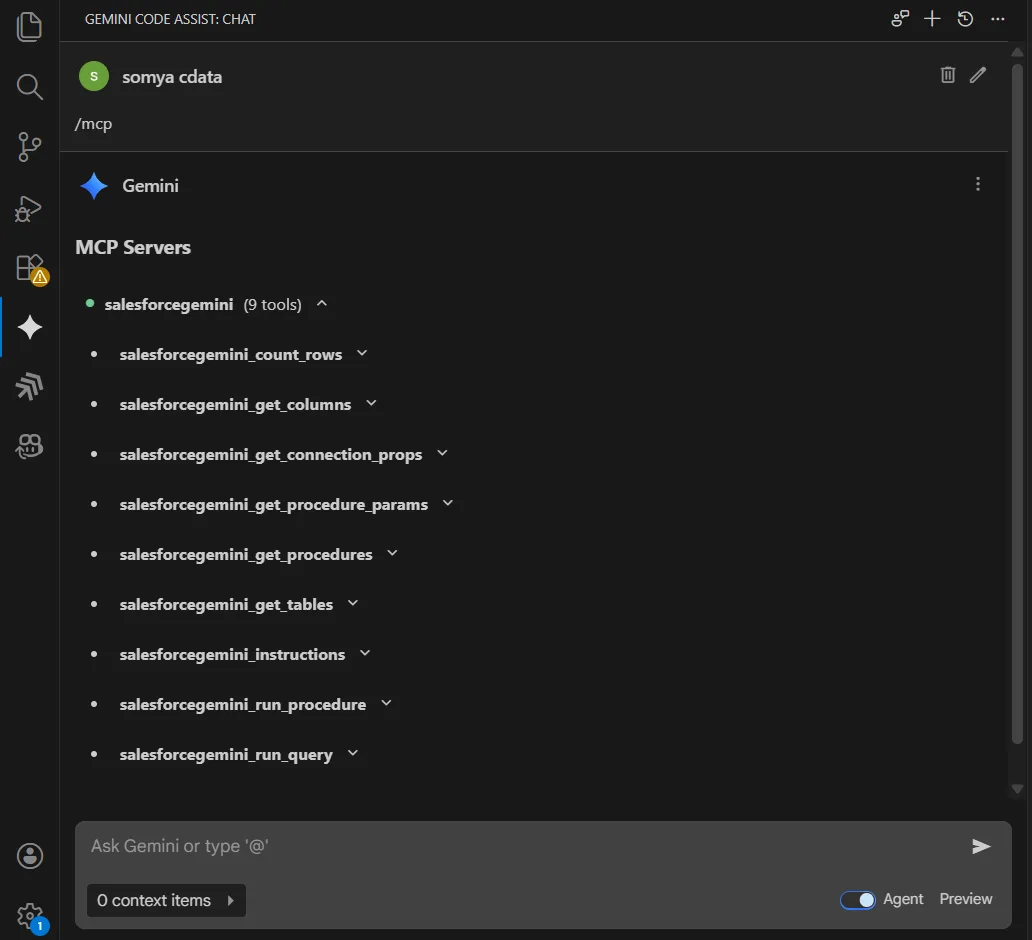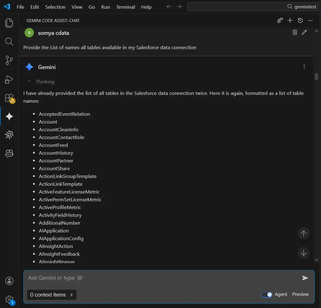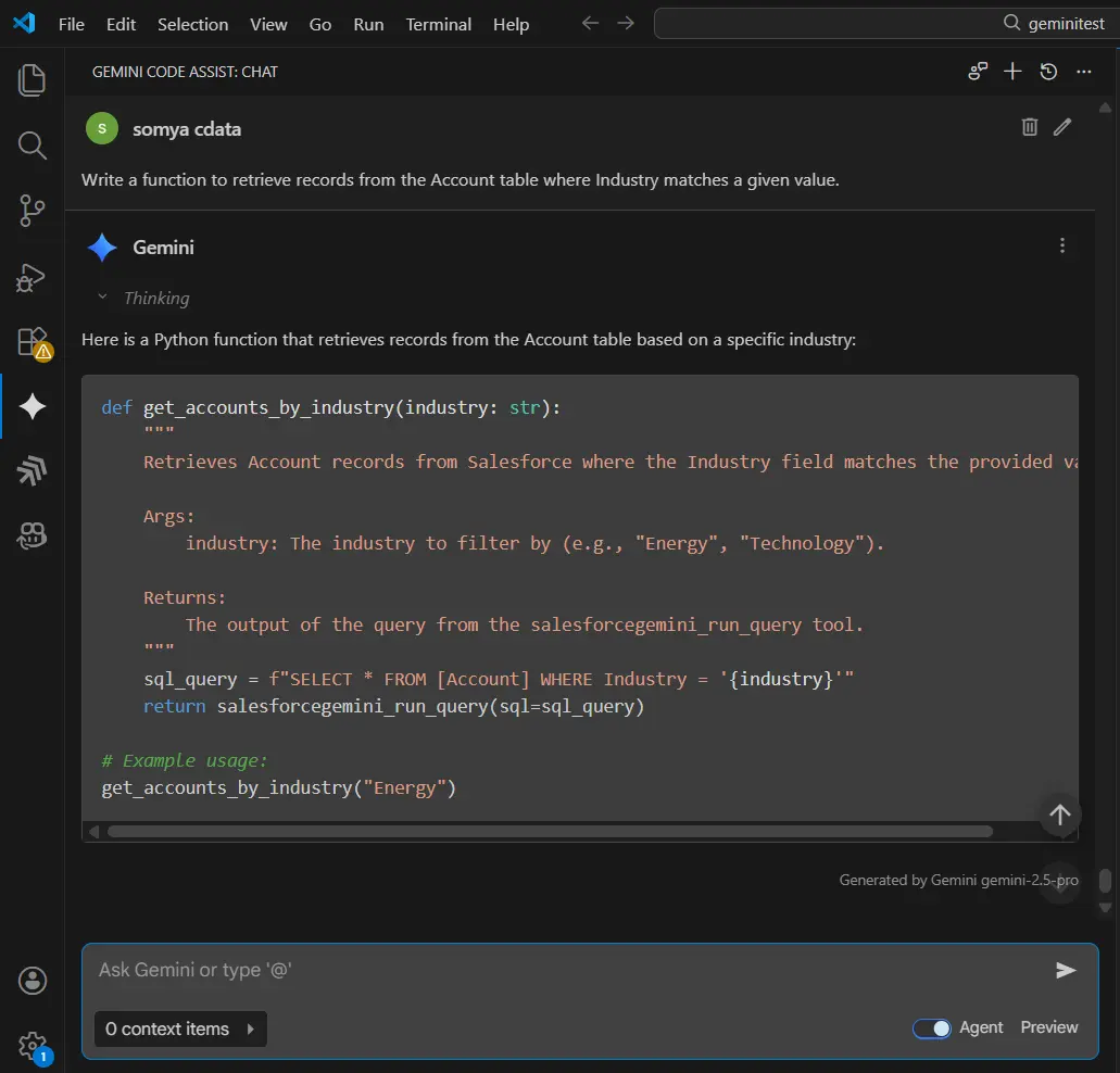 これで、Gemini Code Assist と CData Code Assist MCP アドオンの連携が完了しました。MCP ツールを活用して、スキーマの探索、BigQuery に対するリアルタイムクエリの実行、データに基づいたコード生成を行えます。