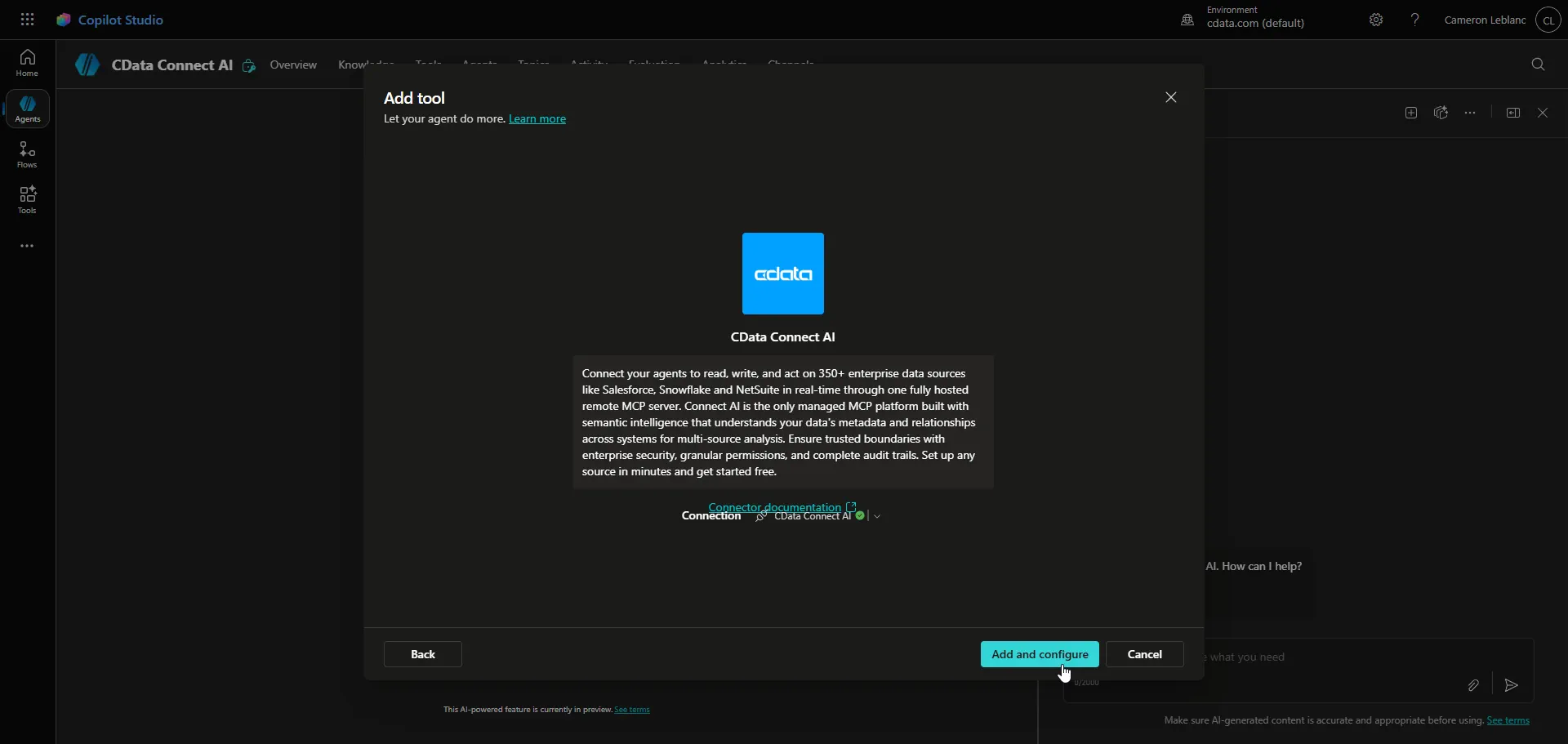 Add and configure をクリックして、CData Connect AI ツールをエージェントに追加します。