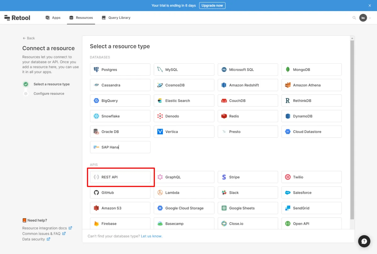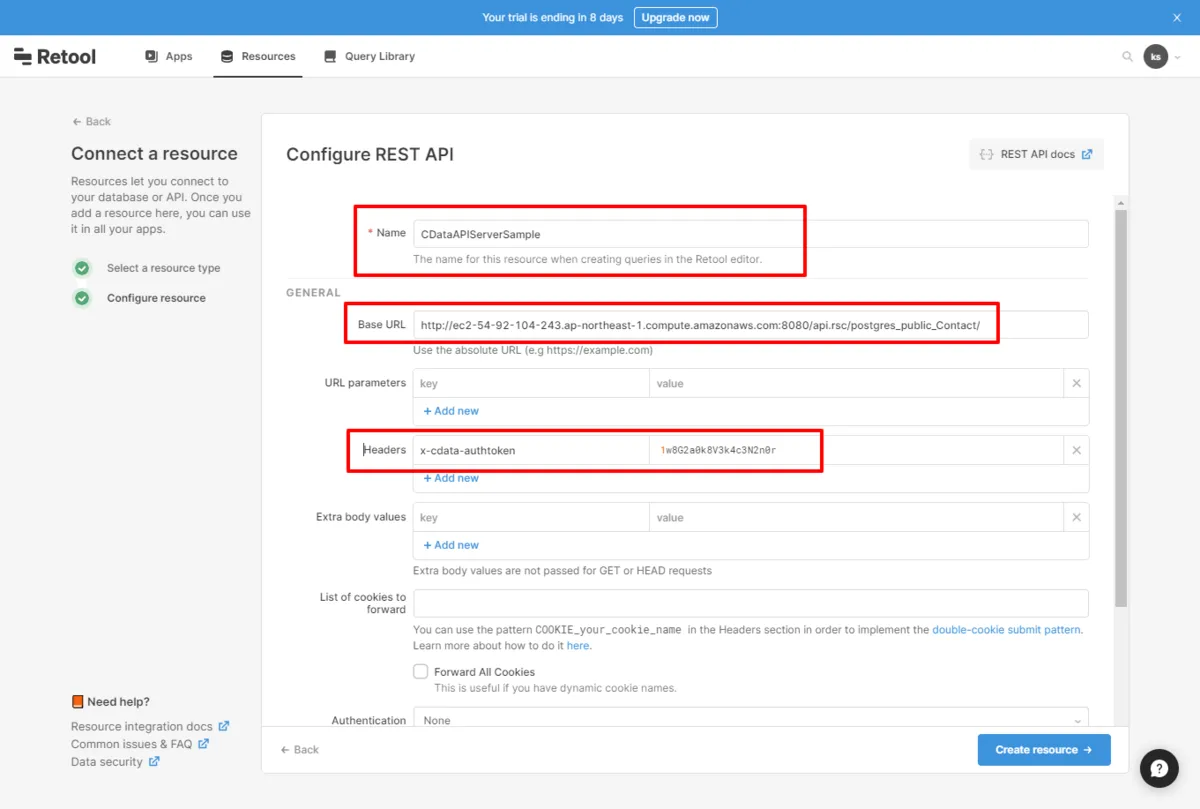 続いてRetool 側の手順を進めていきます。Retool ではまず、構成したAPI にアクセスするためのリソース情報を登録します。