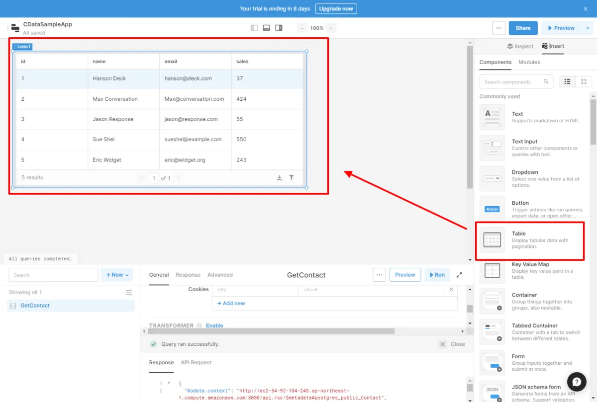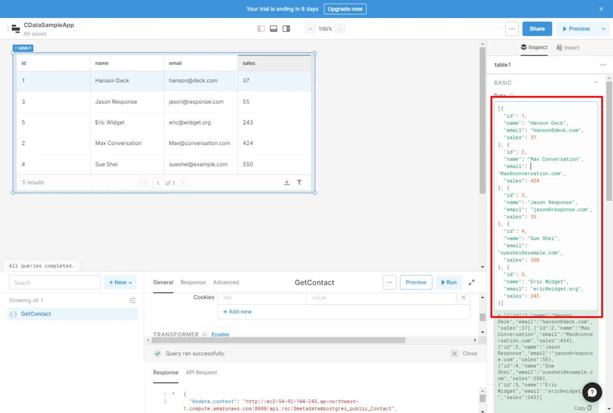 - 先程のクエリ名と対象のオブジェクト名を「{{QueryName.data.value}}」といった形で指定するだけでOKです。これだけで簡単に一覧画面が構成できました。