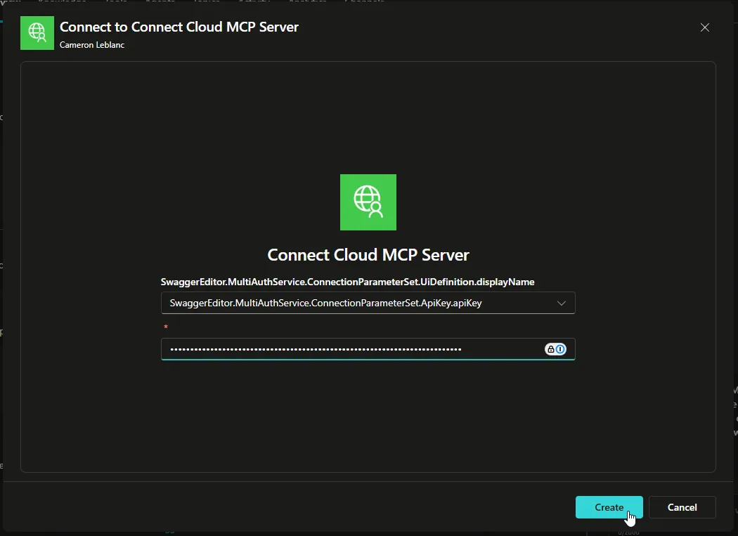 次にMCP ツールの接続を選択/作成するように求められます。「Create new connection」をクリックして新しい接続を作成します。