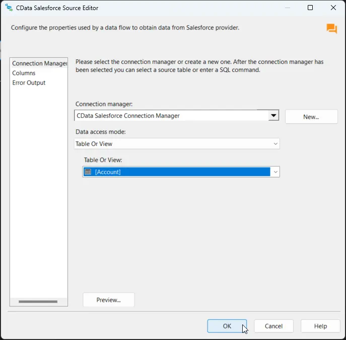 接続を保存後、「Table or view」を選択し、Databricks にエクスポートするテーブルまたはビューを選択して、CData Databricks Source Editor を閉じます。