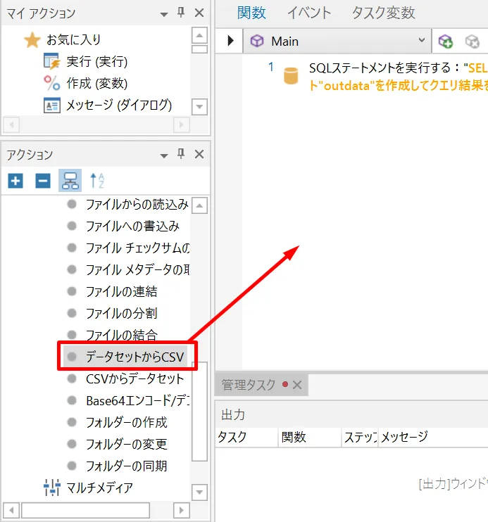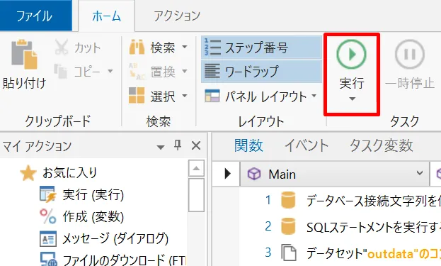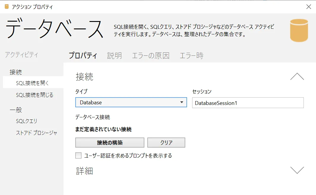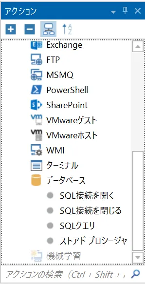 - ODBC 接続は「データベース」のアクションを使って構成していきます。