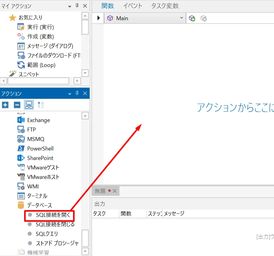- まずは接続を確立します。「SQL 接続を開く」アクションをドラッグアンドドロップで配置しましょう。