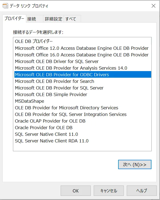 - 接続するプロバイダーを選択します。「Microsoft OLE DB Provider for ODBC Drivers」を選択します。
