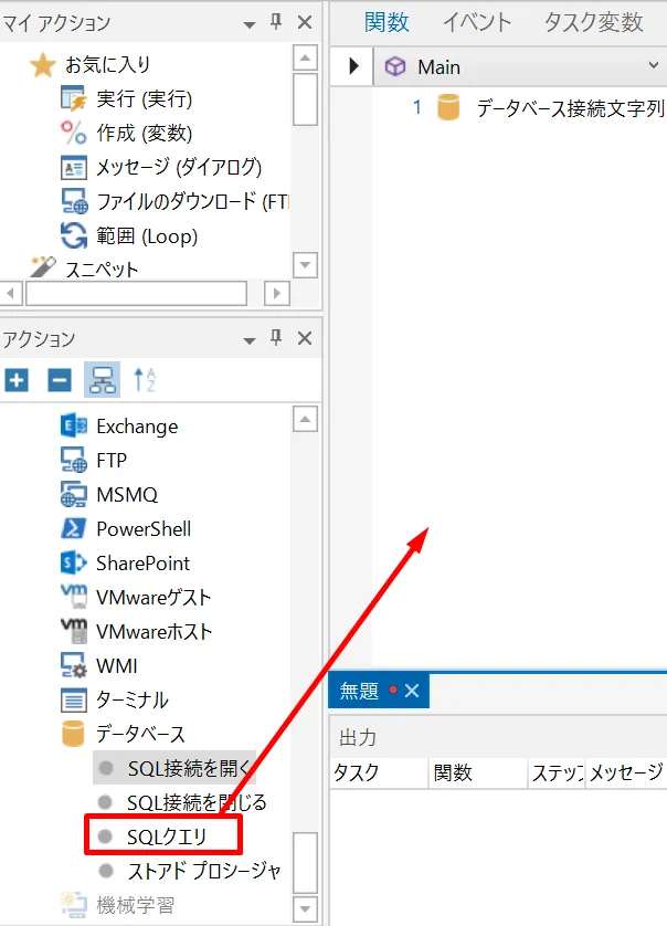 - SQL クエリでデータを取得するため「SQL クエリ」アクションを配置します。