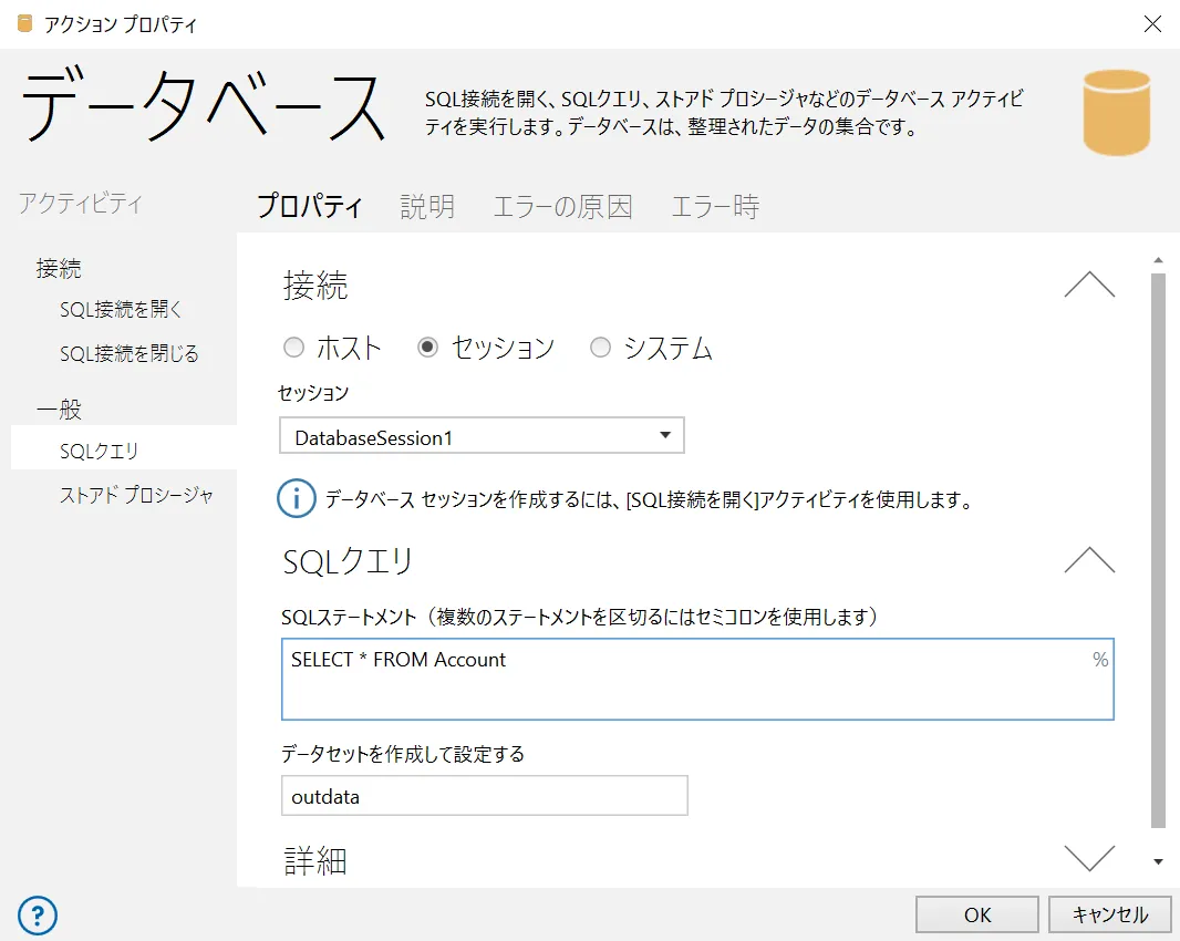 - 「SQL クエリ」アクション では「SQL ステートメント」に対してSQL を入力して、データを取得することができます。