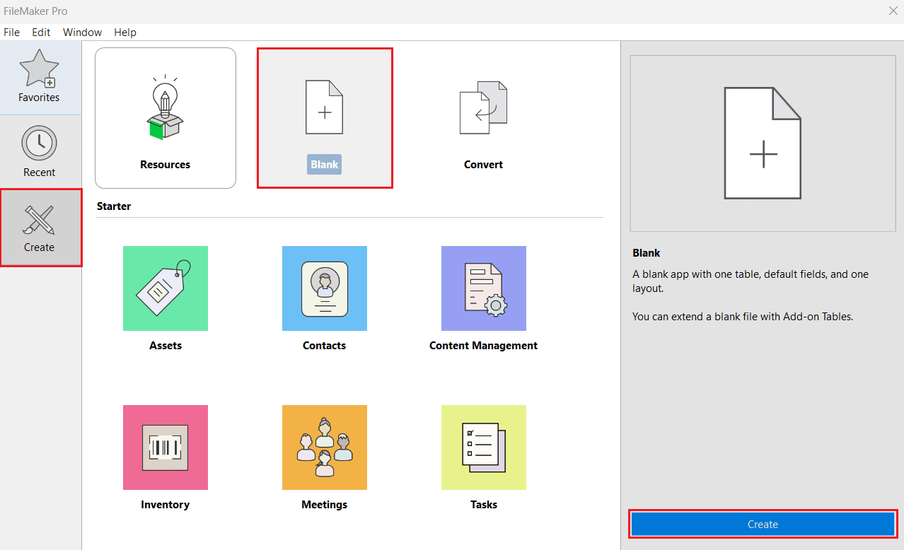 - FileMaker Pro を開きます。左パネルから Create に移動し、Blank > Create を選択します。