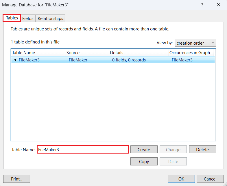 - Fields タブで、テーブルで使用するフィールドを作成・追加します。
