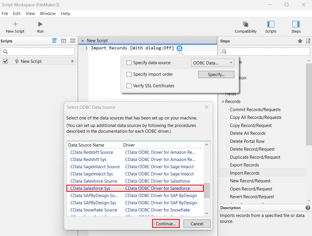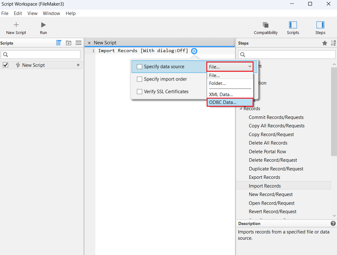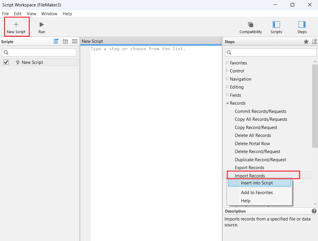- 右側の Steps パネルから Records > Import Records > Insert into Script を選択します。