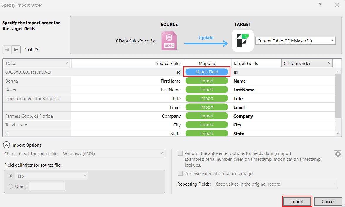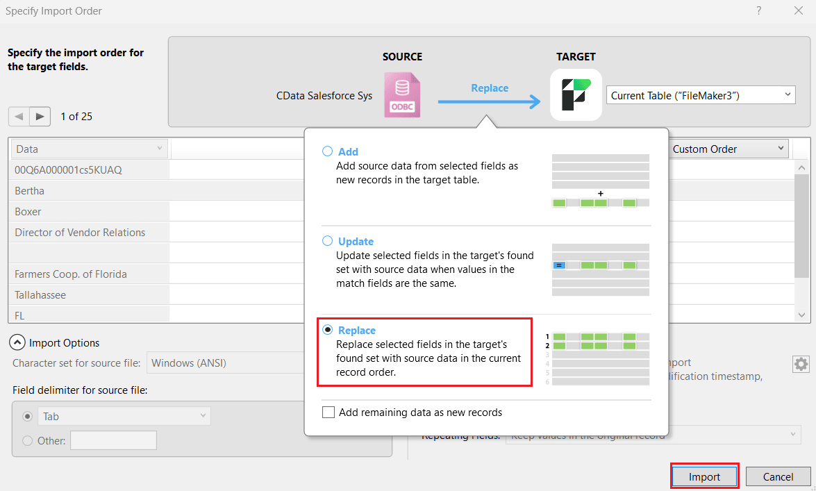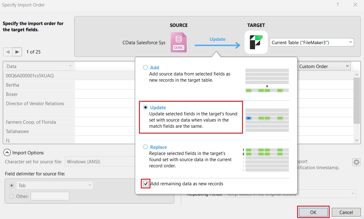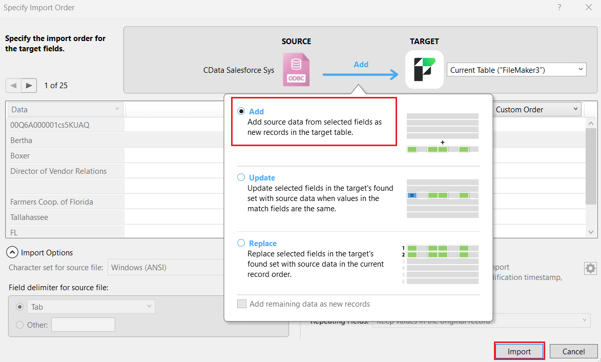 - Specify Import Order ウィンドウで、ソースとターゲットの間で Update を選択して、インポート済みのGitHub データを更新します。これにより、マッチフィールドの値が同じ場合に、選択したフィールドのGitHub データ値でターゲットの検索セットが更新されます。マッピングで少なくとも1つのマッチフィールドを定義し、Add remaining data as new records チェックボックスを選択する必要があります。Import をクリックします。
