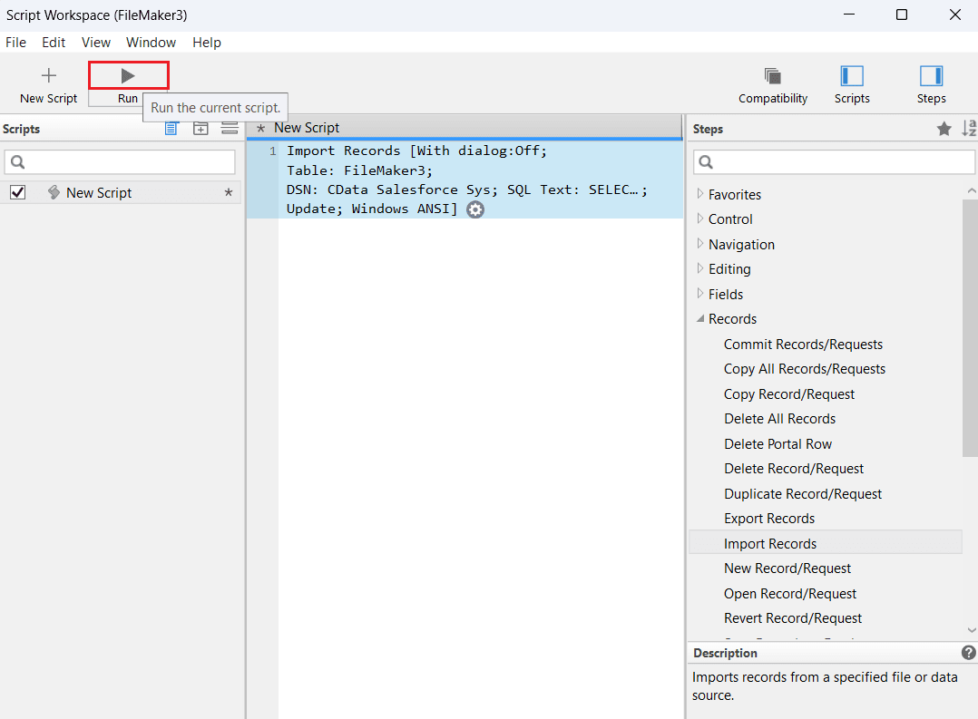 - FileMaker がスクリプトをワークスペースに追加します。Run をクリックしてスクリプトを実行し、インポートクエリを処理します。