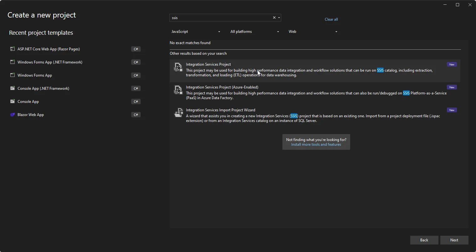 Visual Studio を開き、新しい Integration Services プロジェクトを作成します。