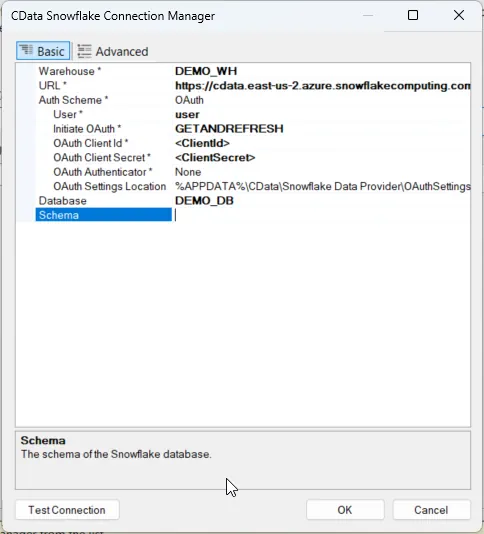 CData Snowflake Connection Manager で接続プロパティを設定し、接続をテストして保存します。