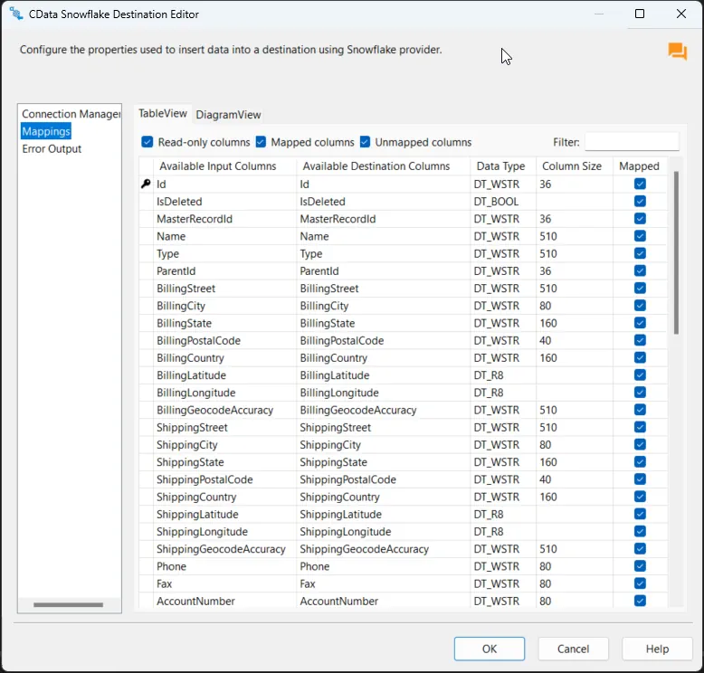 Column Mappings タブで、入力カラムからデスティネーションカラムへのマッピングを設定します。