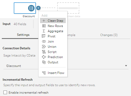 - まず、テーブルの横にあるプラス をクリックし、「クリーンステップ」オプションを選択します。