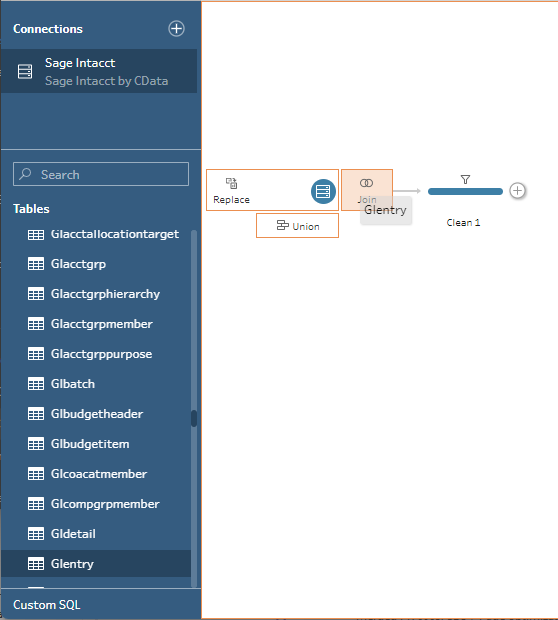 - 複数のテーブルを結合するには、関連テーブルをキャンバス上の既存のテーブルの横にドラッグし、結合ボックスに配置します。
