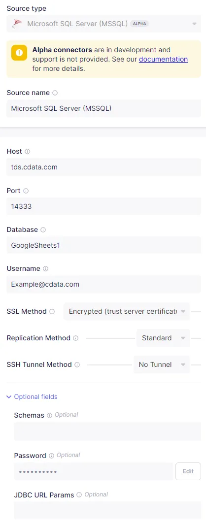 - Source Type を MSSQL Server に設定して TDS エンドポイントに接続します