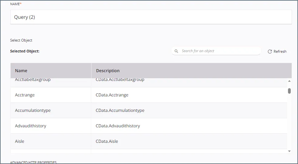 - クエリ操作をダブルクリックすると、OData エンドポイントで使用可能なすべてのテーブルと派生ビューが表示されます。