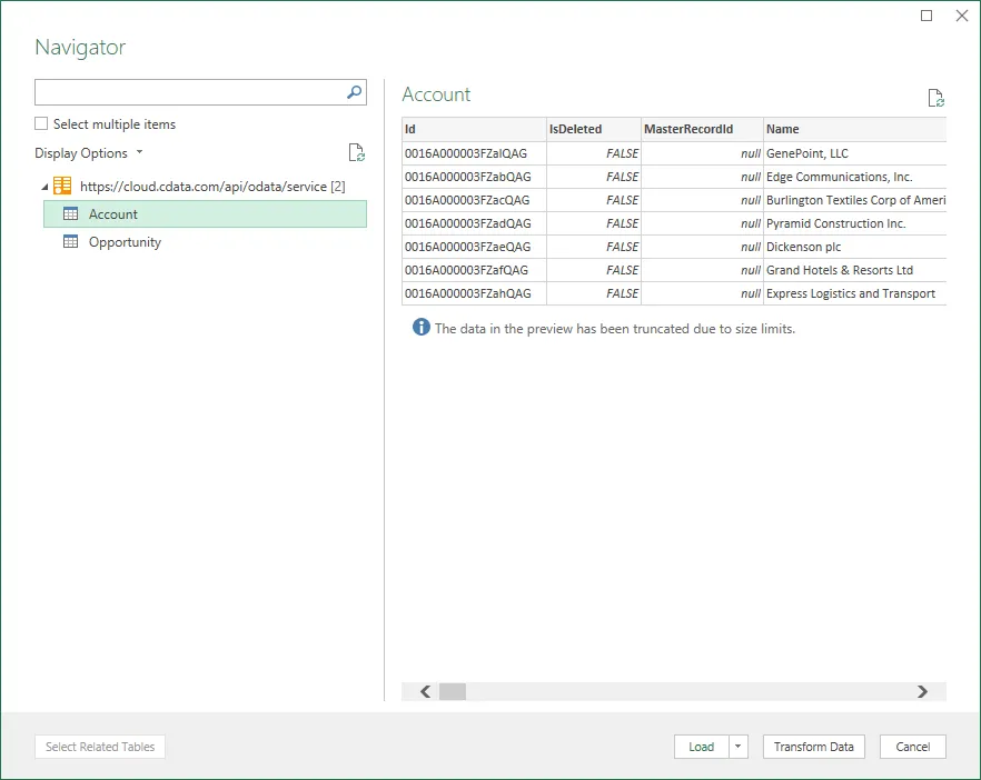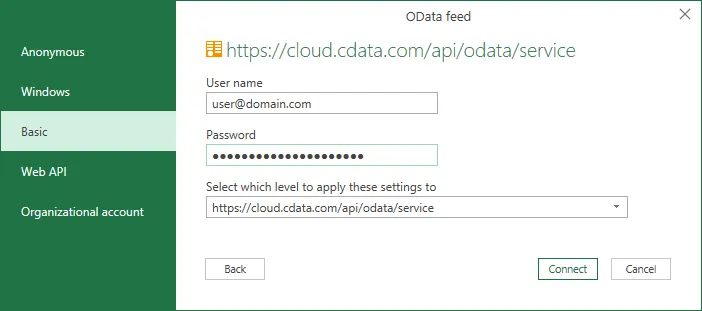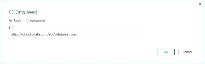 OData フィードのURL を入力します(例:https://cloud.cdata.com/api/odata/{workspace_name})