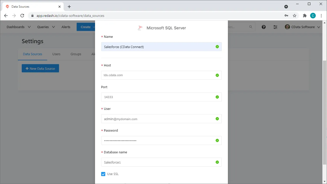 Virtual SQL Server を使用してRedash からCData Connect AI への接続を確立するには、以下の手順に従います: