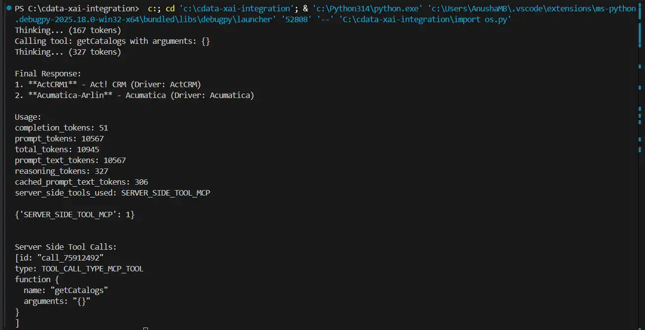 このコードでは、Grok AI クライアントを初期化し、Basic 認証を使って MCP 経由で CData Connect AI に接続して、レスポンスをリアルタイムでストリーミングします。エージェントは利用可能なツールを自動的に検出し、ライブデータにクエリを実行して、ツール呼び出しと最終結果の両方を表示します。