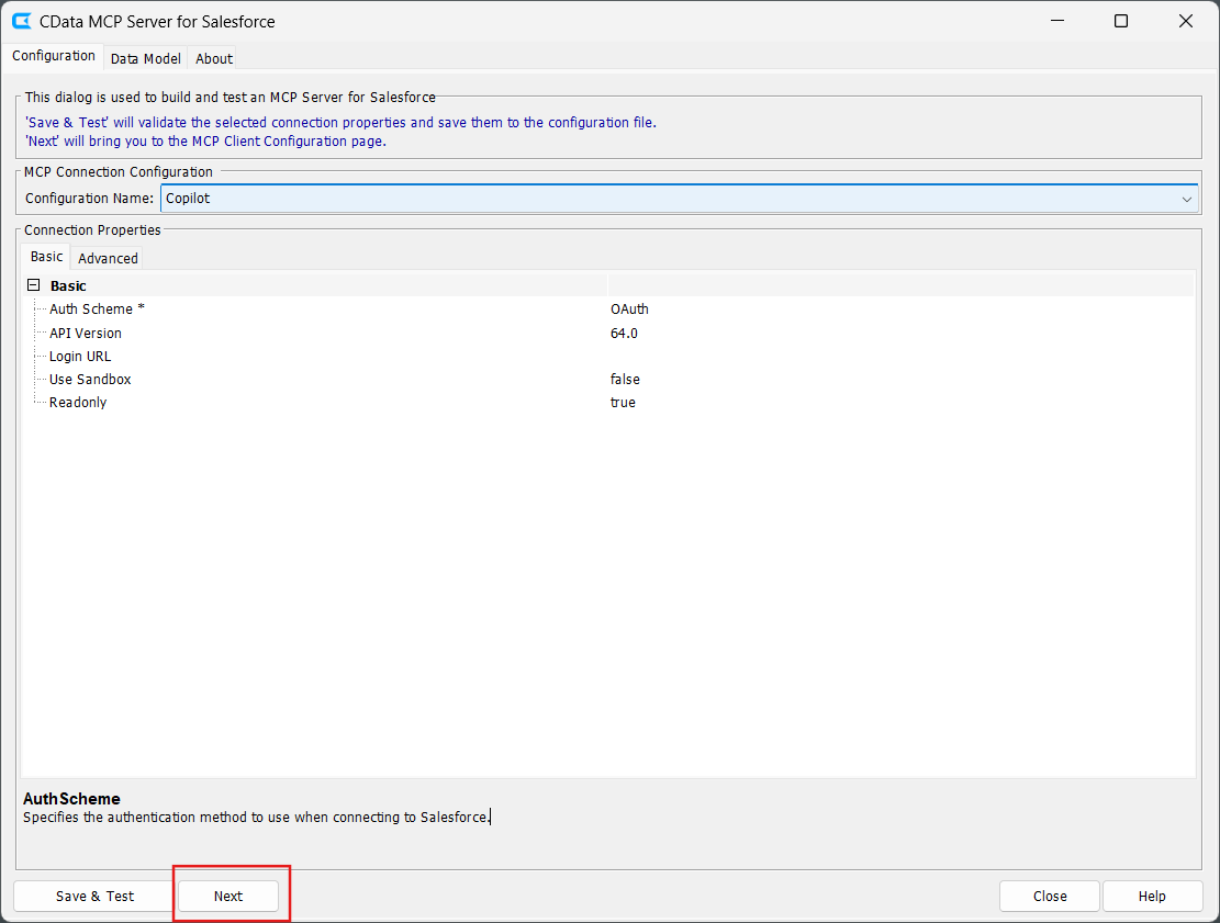 - 設定ウィザードで接続の保存とテストが完了したら、Next をクリックします。