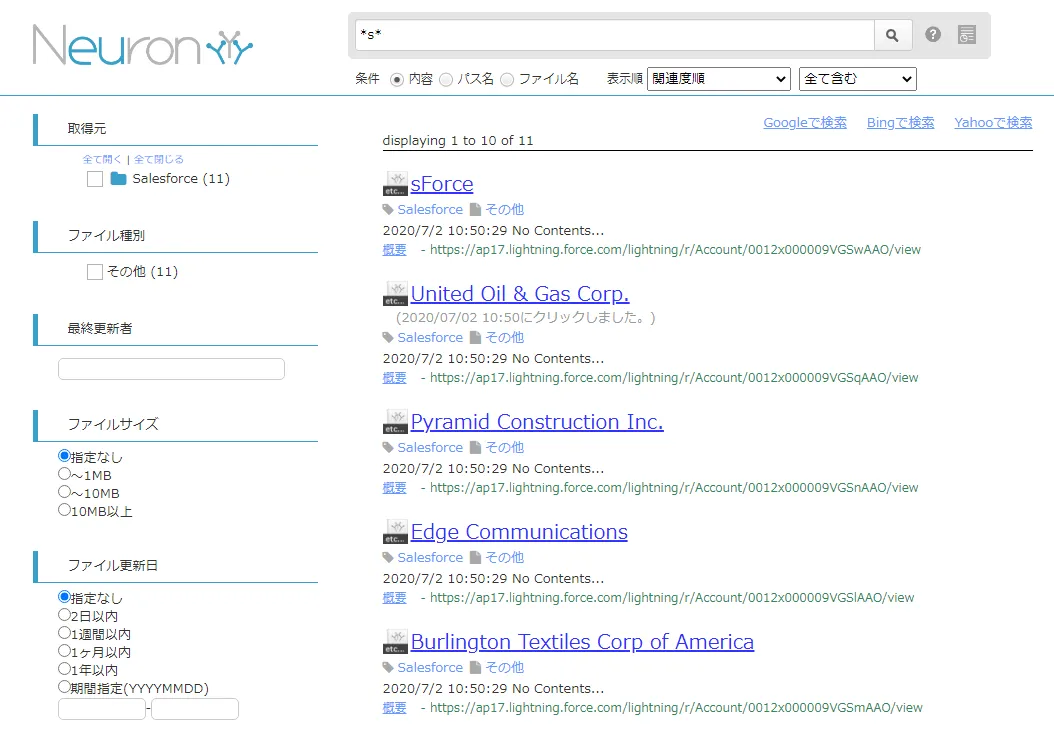実際にNeuron 上で検索ができるか確認してみます。取得元を絞り込むこと、内容やファイル名での検索、ファイルサイズやファイル更新日の絞り込み、部分一致や全部一致で検索が可能です。 検索をかけてみると、以下のようにデータを取得できました。