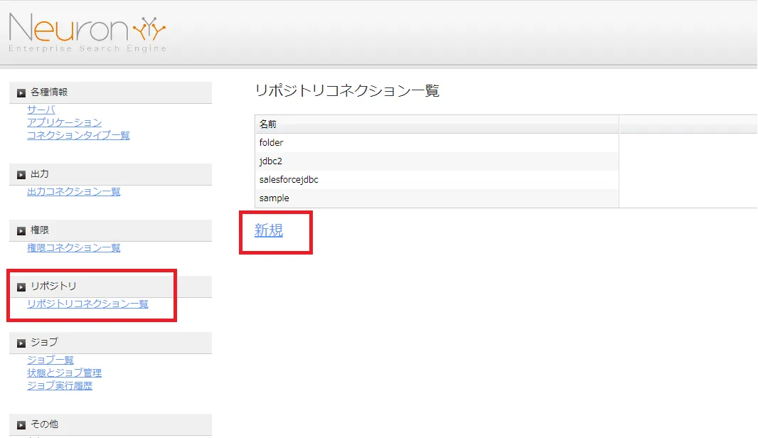 Neuron CF でクローラーの設定をGUI で行います。JDBC を読み取るためのリポジトリを作成します。Neuron の管理画面にログインし、[リポジトリ]→[リポジトリコレクション一覧]→[新規]をクリックします。