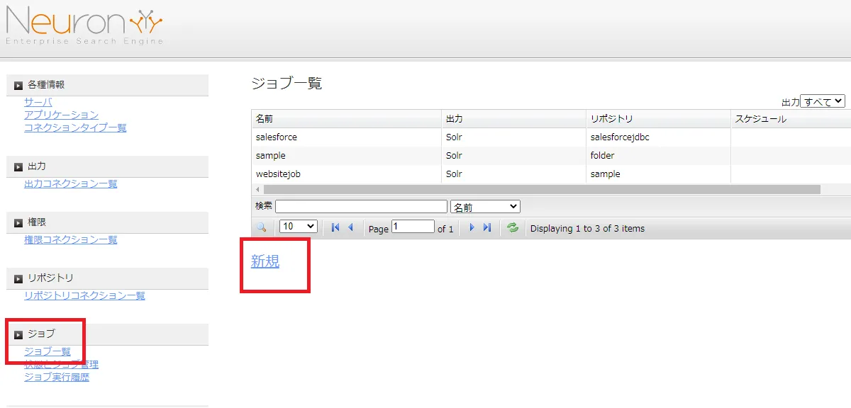 管理画面で[ジョブ]→[ジョブ一覧]→[新規]とクリックします。