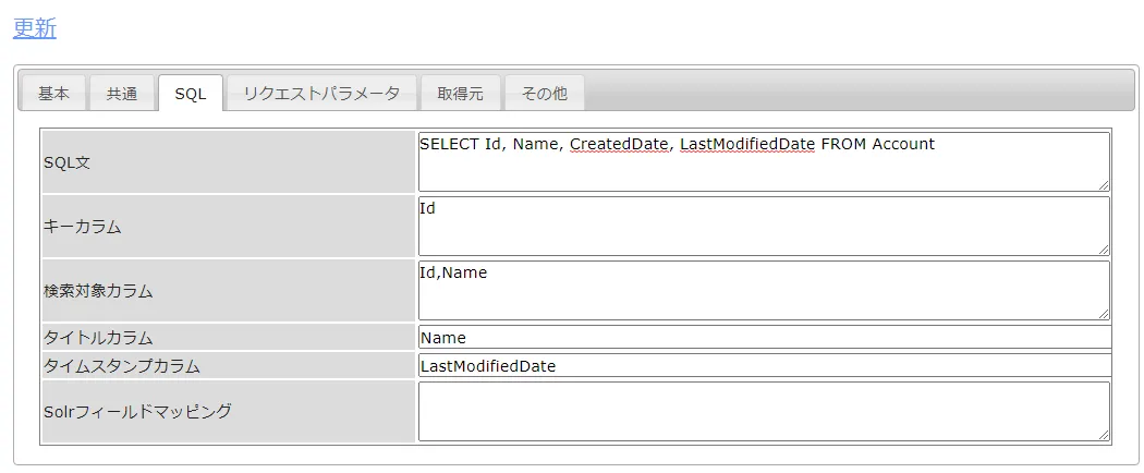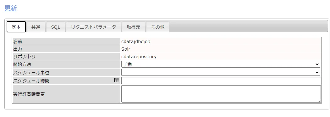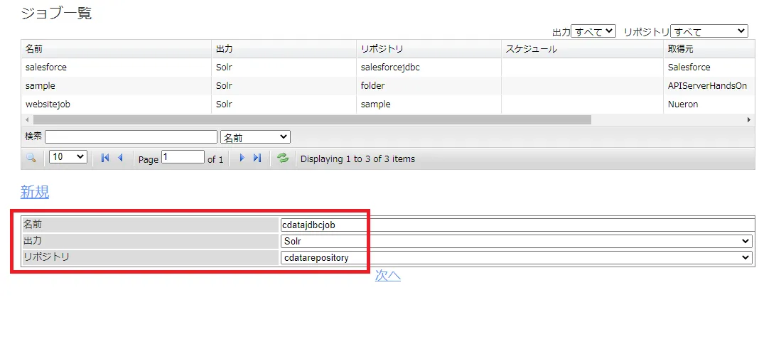 任意のジョブ名を入力します。出力先にはSolr を選択します。リポジトリは先ほど作成したLakebase に接続するリポジトリコレクションを選びます。