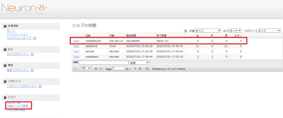 実際にNeuron で作成したジョブを実行します。[ジョブ]→[状態とジョブ管理]をクリックし、作成したジョブの[Start]をクリックします。
