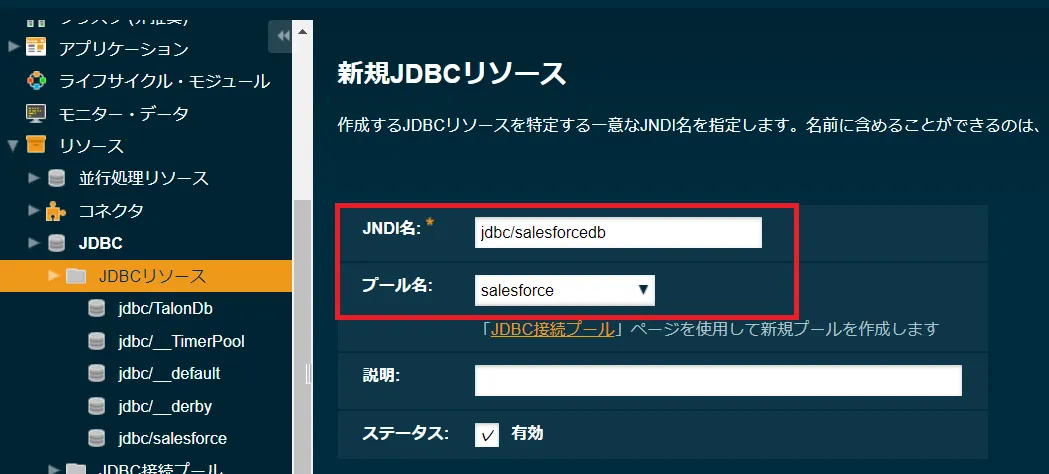 - JNDI名:talonJdbc.properties で設定した jndi名 を指定
