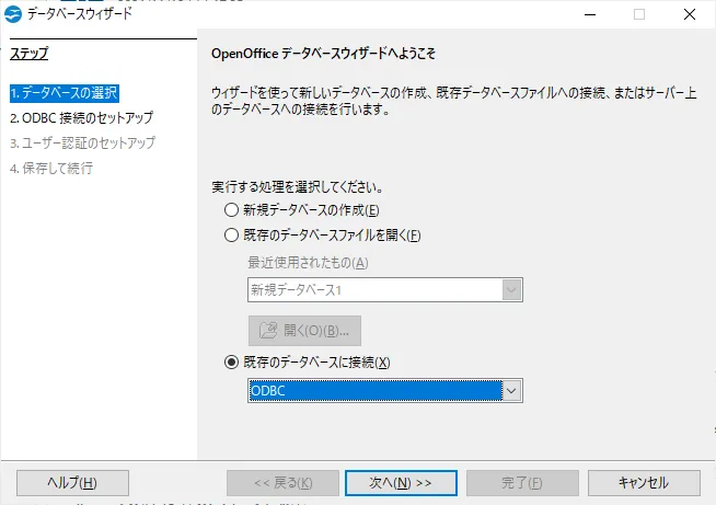 - OpenOffice Base を立ち上げて「既存のデータベースに接続」から「ODBC」を選択し、「次へ」をクリックします。