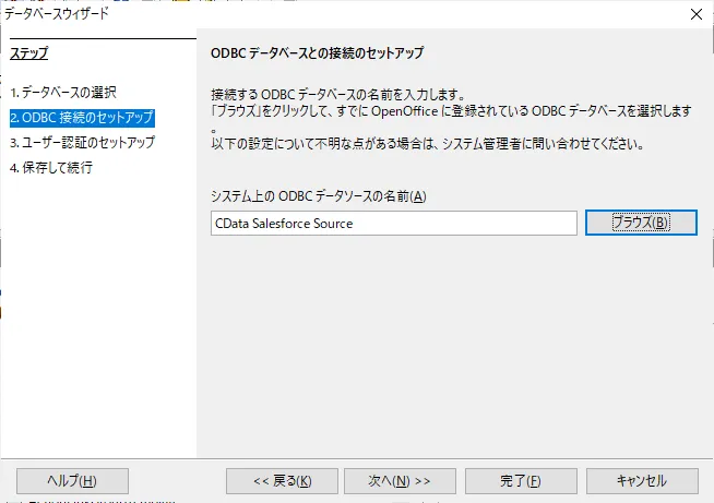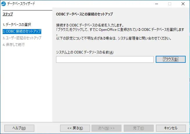 - システム上のODBC データソースの名前を入力する画面が表示されるので「ブラウズ」をクリックし、
