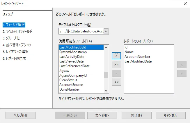 - レポートウィザードでは「テーブルまたはクエリー」でLakebase のオブジェクトを選択できるので、任意のテーブルを選択し、使用したいフィールドを設定していくだけでOK です。