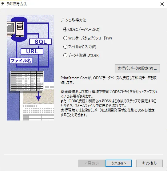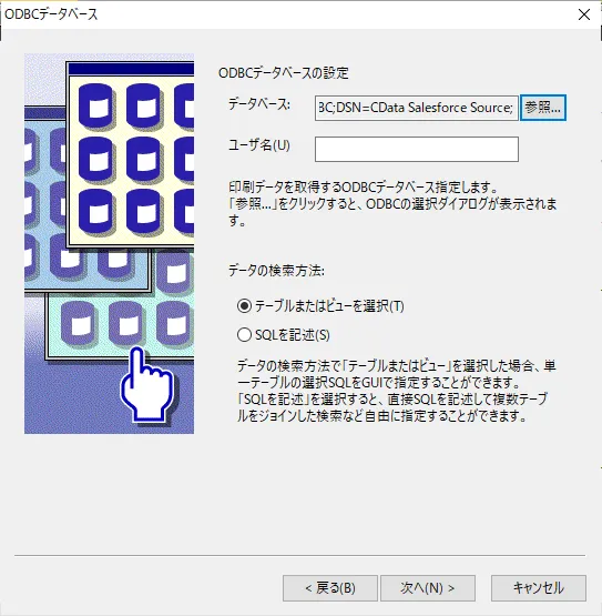 - データの取得方法から「ODBC データベース」を選択し、「次へ」をクリック