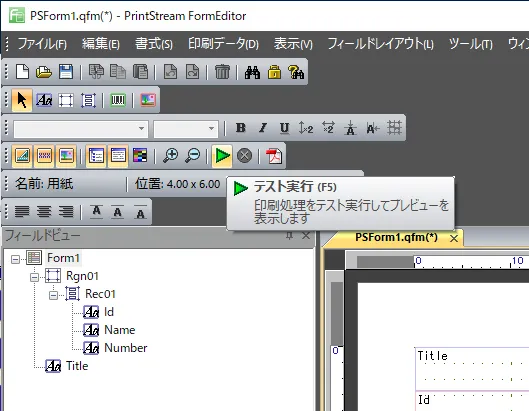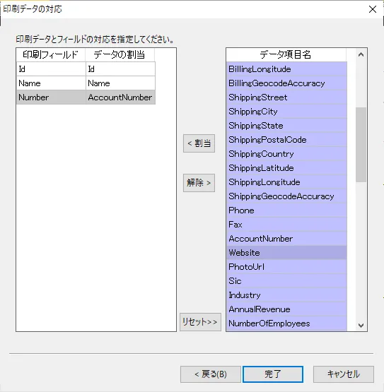 - 最後に帳票デザインに配置した印刷フィールドと読み込んだデータ項目をマッピングします。