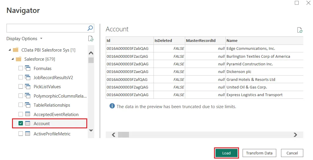 - ナビゲーターダイアログで必要なテーブルを選択します。読み込みをクリックして Power BI で Sage Cloud Accounting のデータ を表示します。