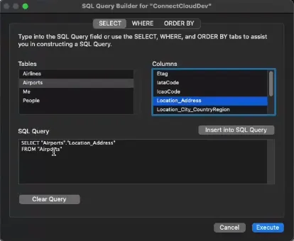 - SQL Query Builder の「SELECT」タブで、クエリに含めるカラムを選択。