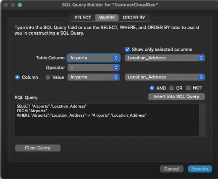 - SQL Query Builder の「WHERE」タブを開き、「Show only selected columns」を選択。